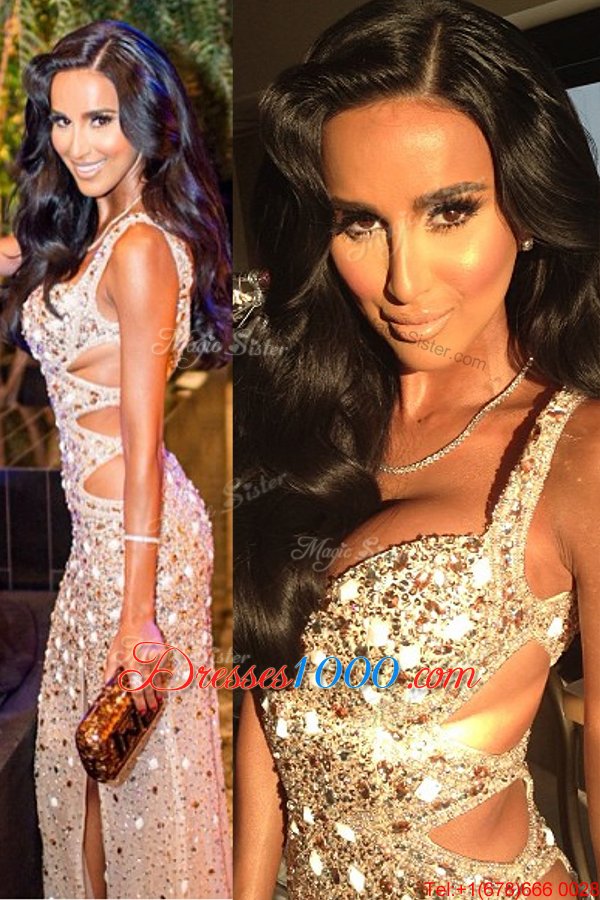 Delicate Scoop Sequins Peach Sleeveless Sequined Backless Evening Dress for Prom