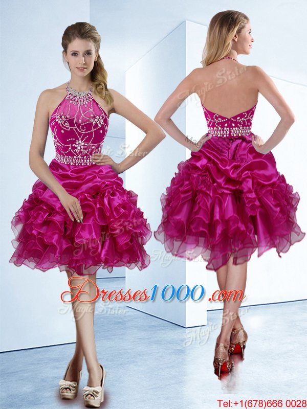 Fantastic Halter Top Fuchsia Zipper Pageant Dresses Beading and Ruffles and Pick Ups Sleeveless Knee Length