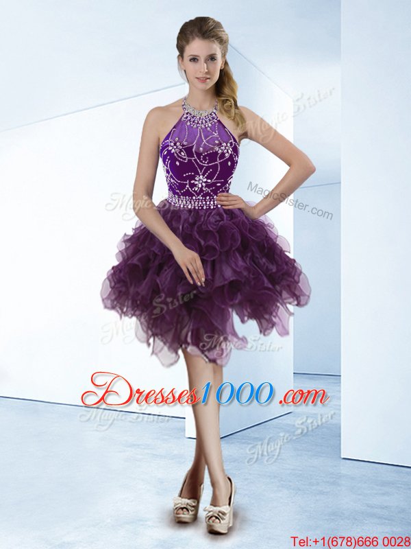Modest Dark Purple Halter Top Zipper Beading Pageant Dress for Womens Sleeveless