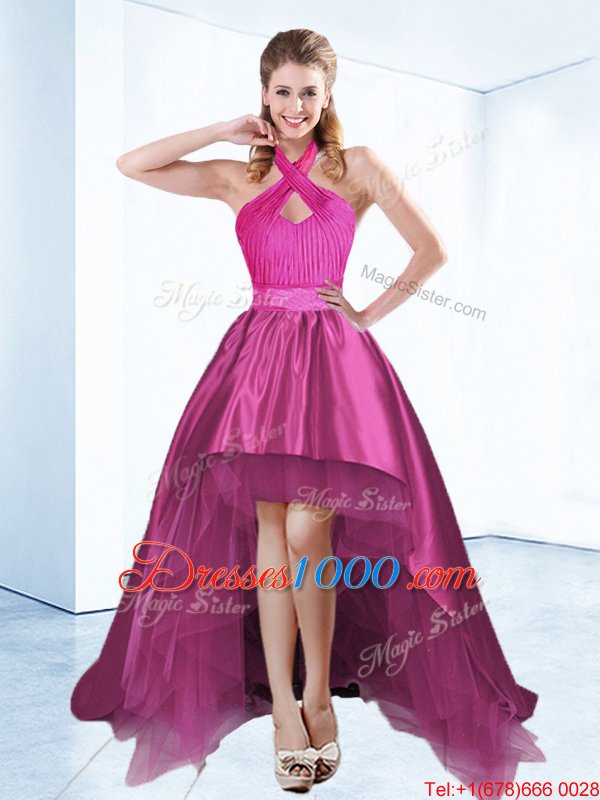Classical Halter Top Satin Sleeveless High Low High School Pageant Dress and Ruching and Bowknot and Belt