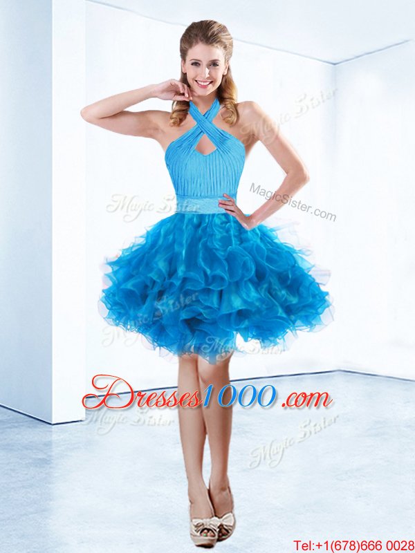 Halter Top Sleeveless Mini Length Ruching and Belt Zipper Pageant Dresses with Baby Blue