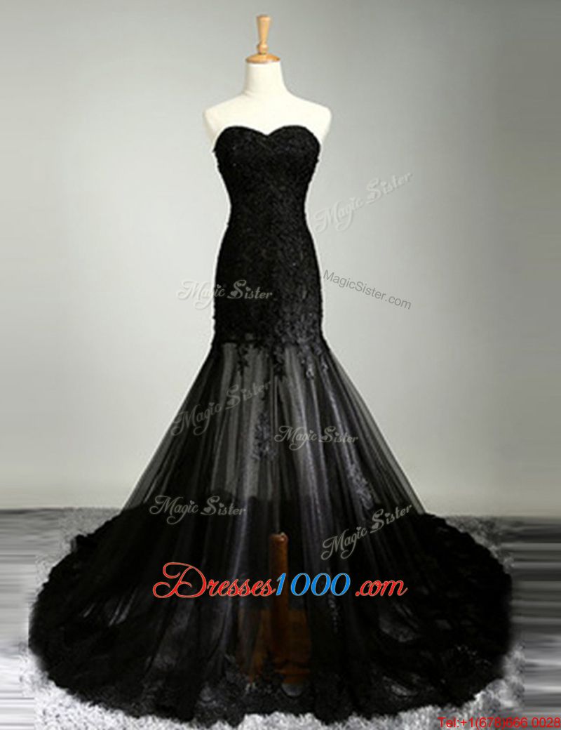 Mermaid Sleeveless With Train Lace Zipper Formal Evening Gowns with Black Brush Train