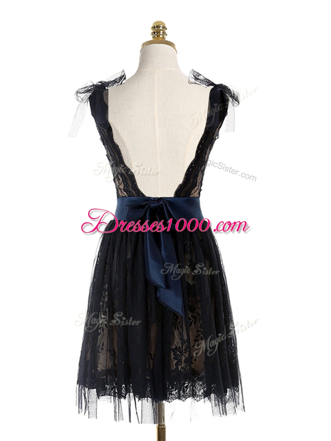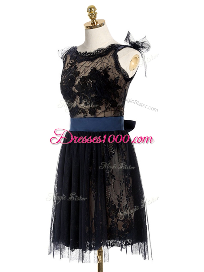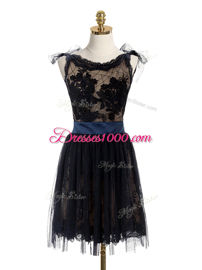 Black Backless Scoop Lace and Belt Prom Dress Lace Sleeveless