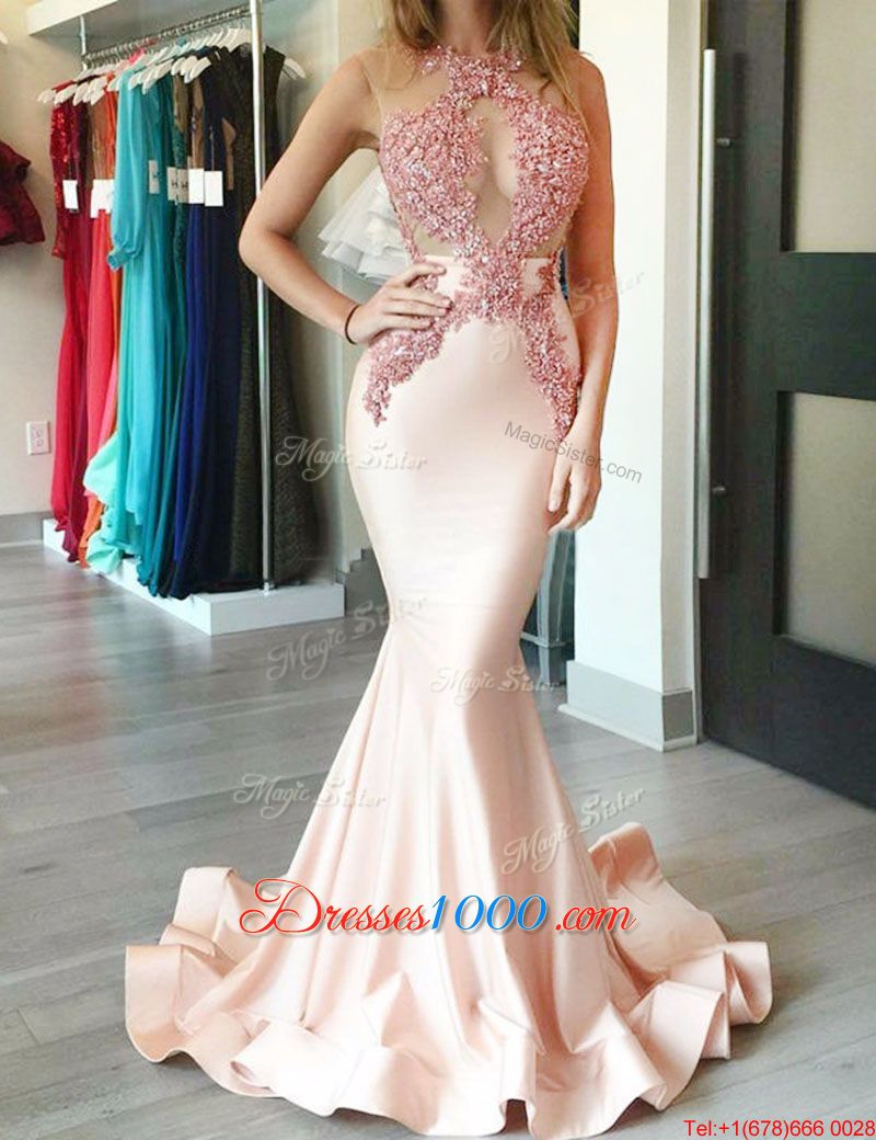 Inexpensive Mermaid Halter Top With Train Zipper Evening Outfits Peach and In for Prom with Appliques Brush Train