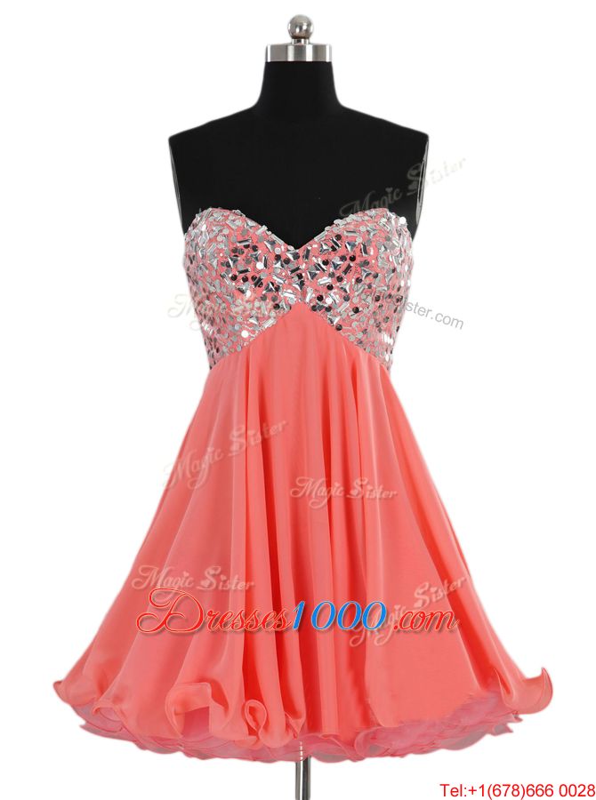Watermelon Red Chiffon Lace Up Sweetheart Sleeveless Mini Length Teens Party Dress Beading