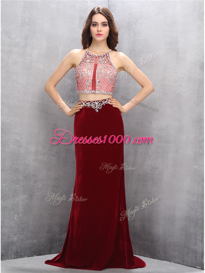 Colorful Scoop Criss Cross With Train Burgundy Evening Dress Silk Like Satin Sweep Train Sleeveless Beading