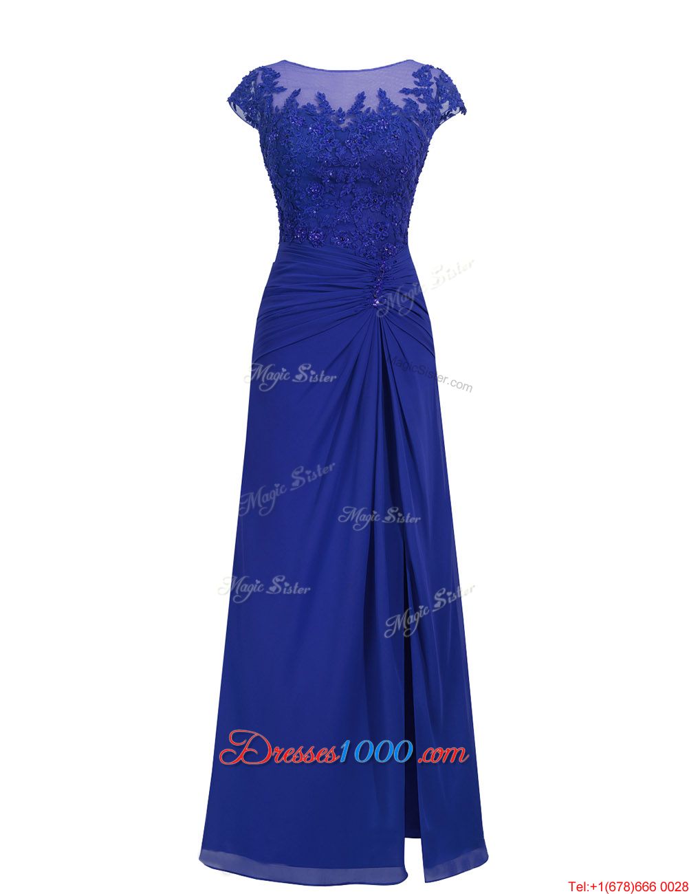 Stunning Scoop Floor Length Royal Blue Homecoming Dress Chiffon Cap Sleeves Appliques