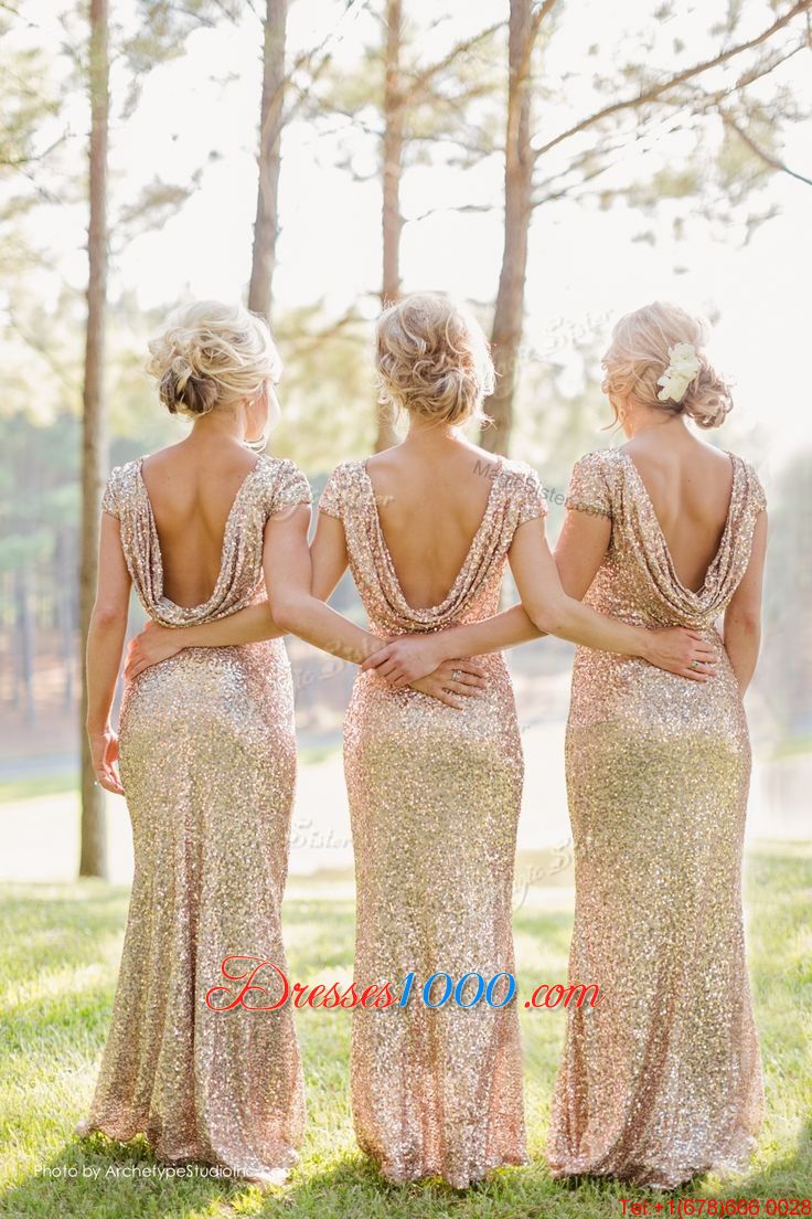 Sequins Mermaid Juniors Evening Dress Champagne Scoop Sequined Cap Sleeves Floor Length Zipper