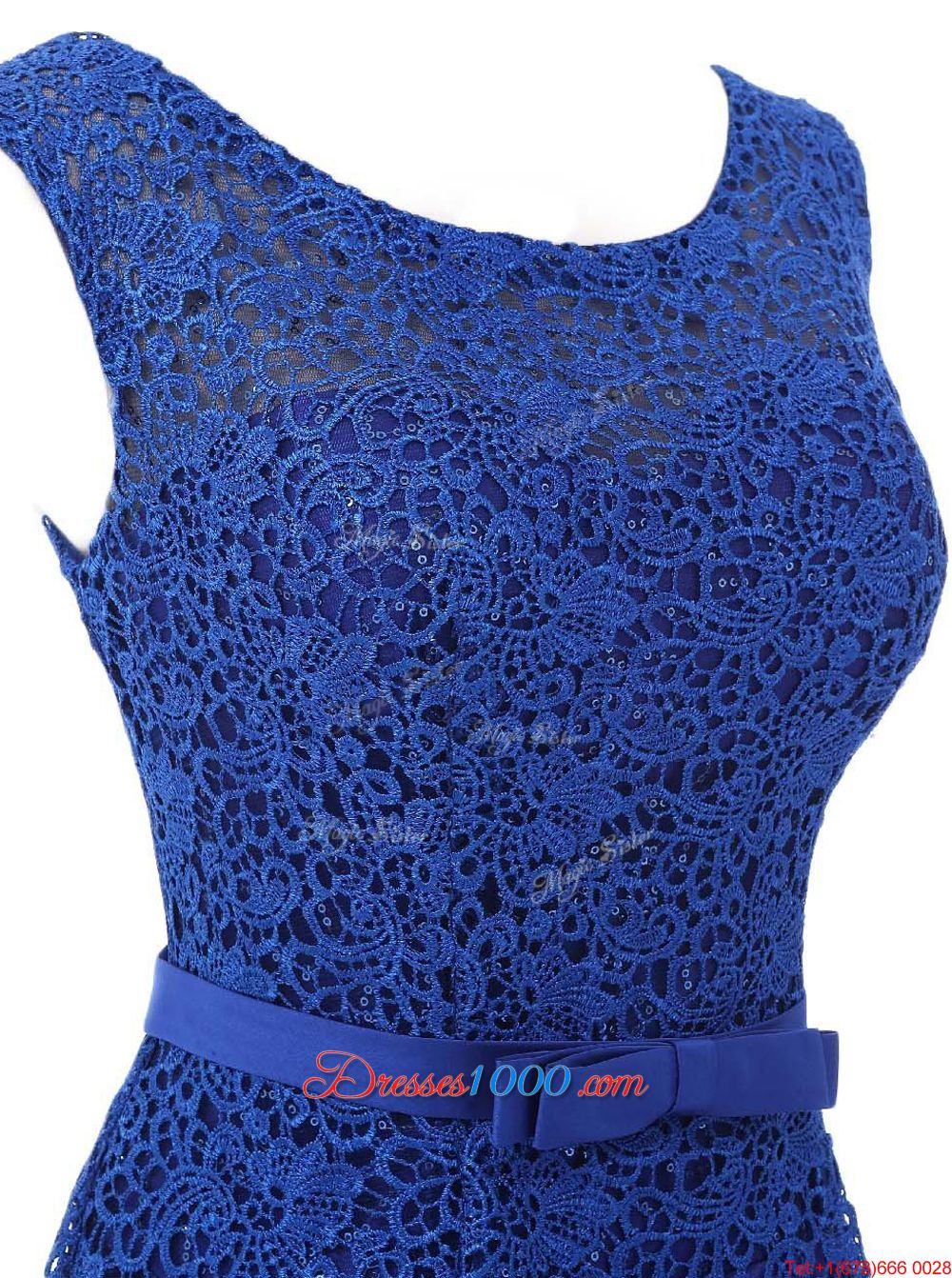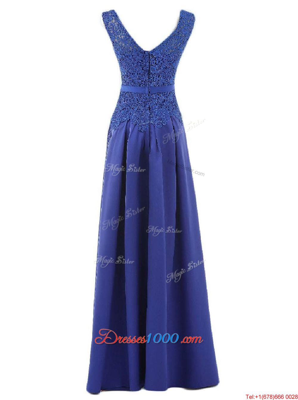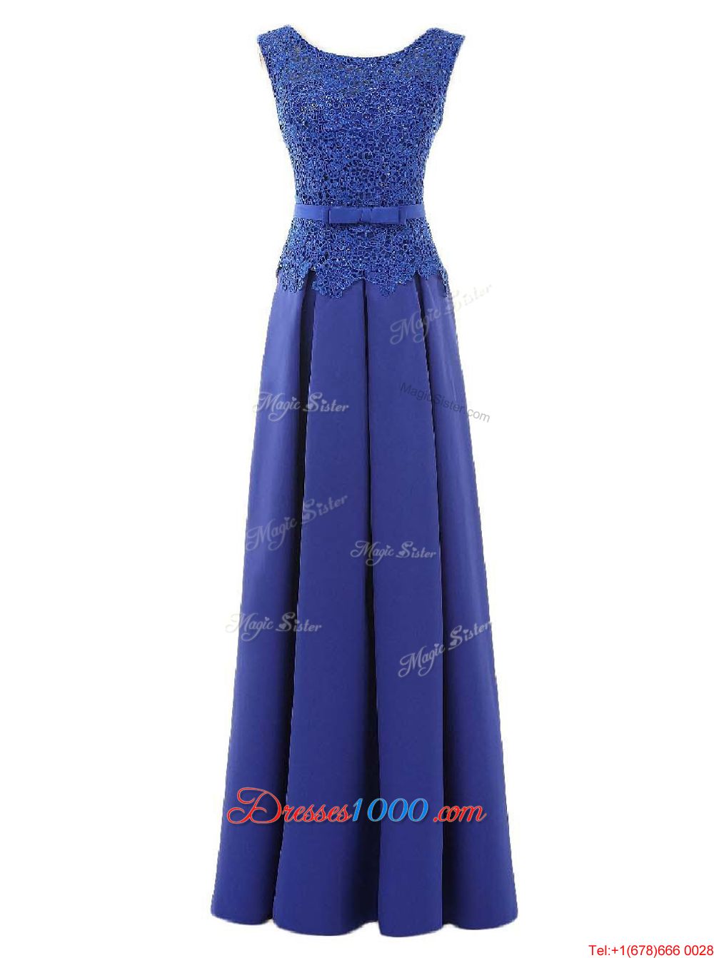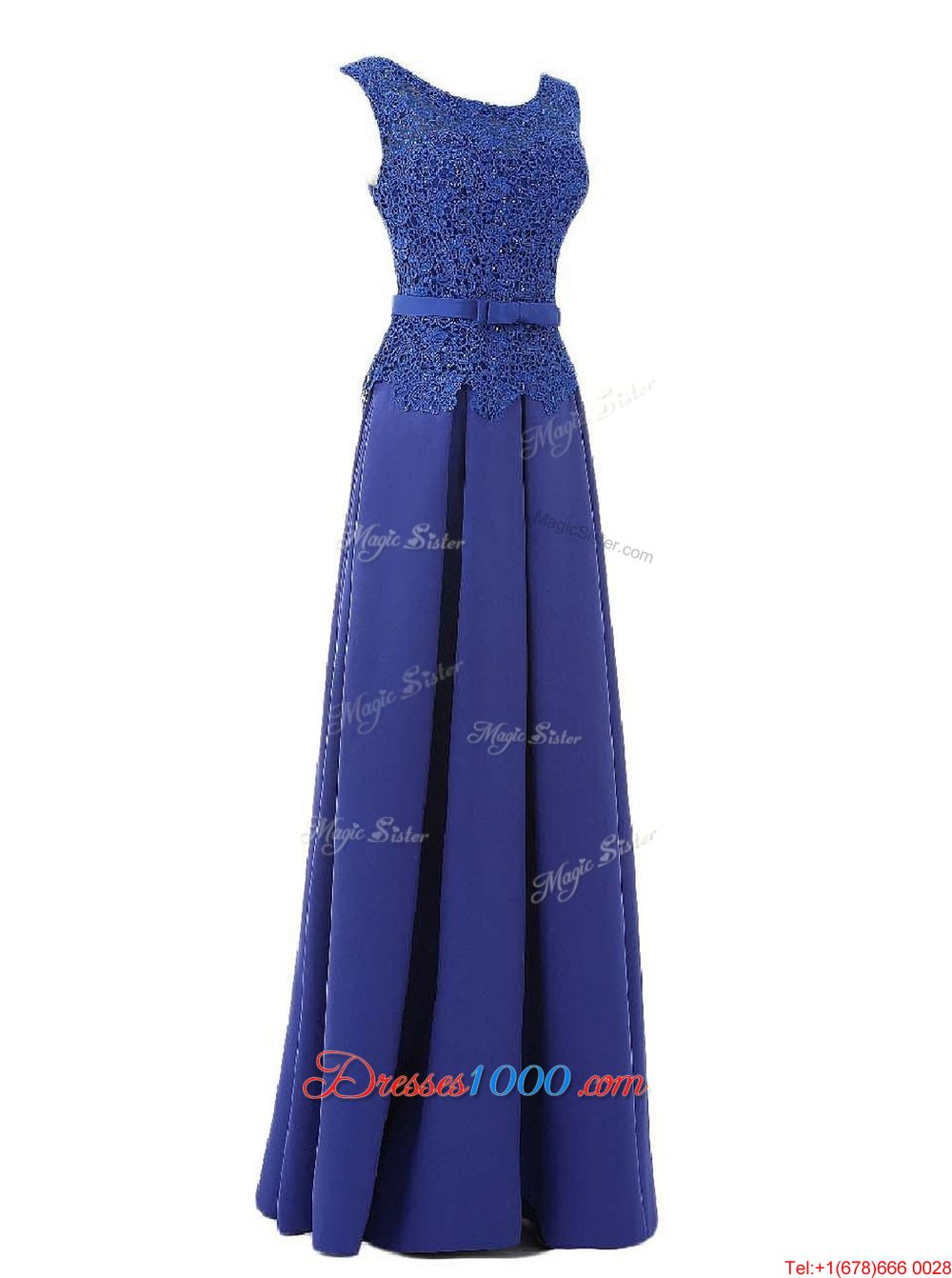 Scoop Blue Satin Zipper Prom Homecoming Dress Sleeveless Floor Length Lace and Belt