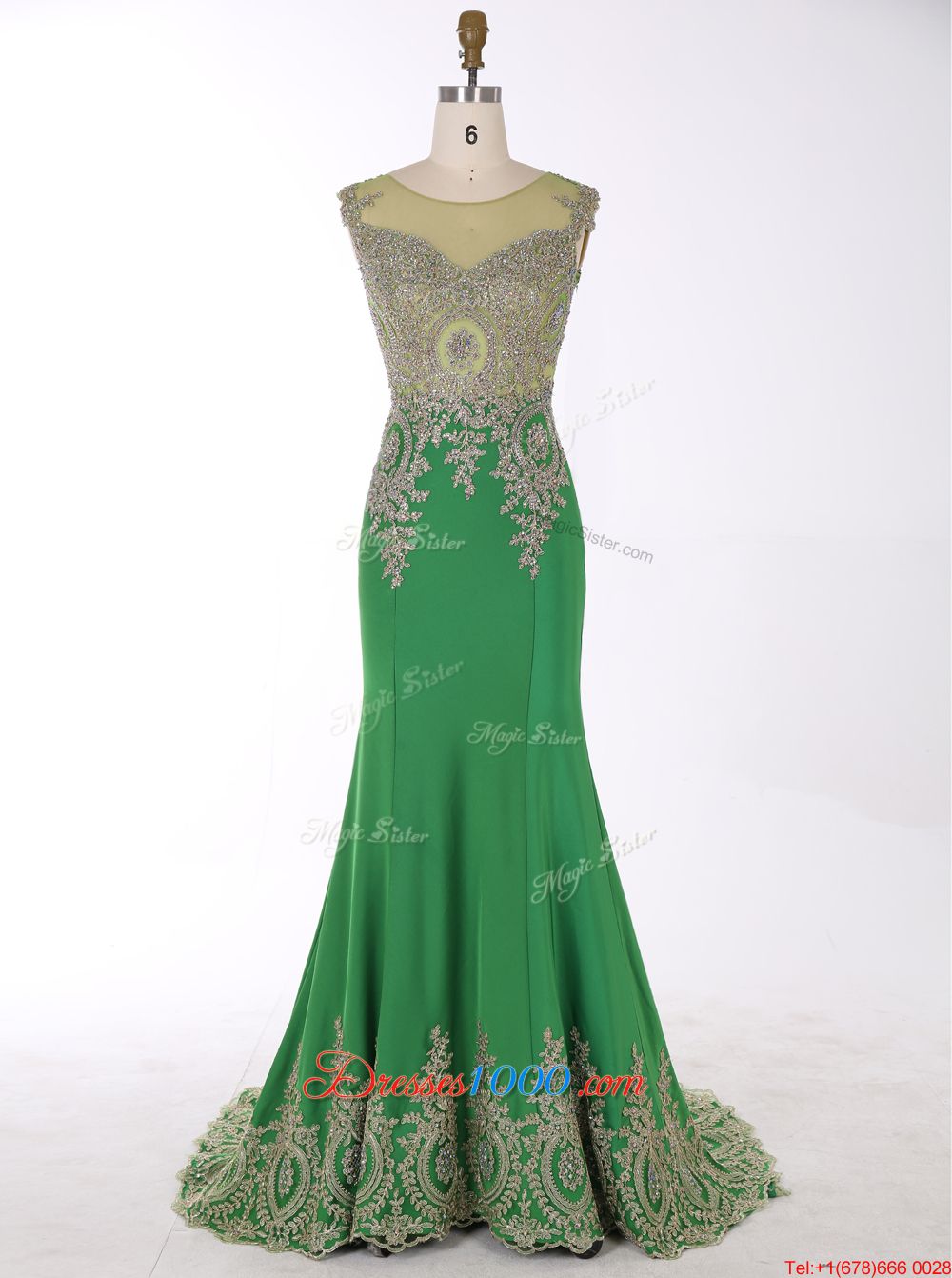 Chic Mermaid Green Scoop Neckline Beading and Appliques Evening Gowns Sleeveless Zipper