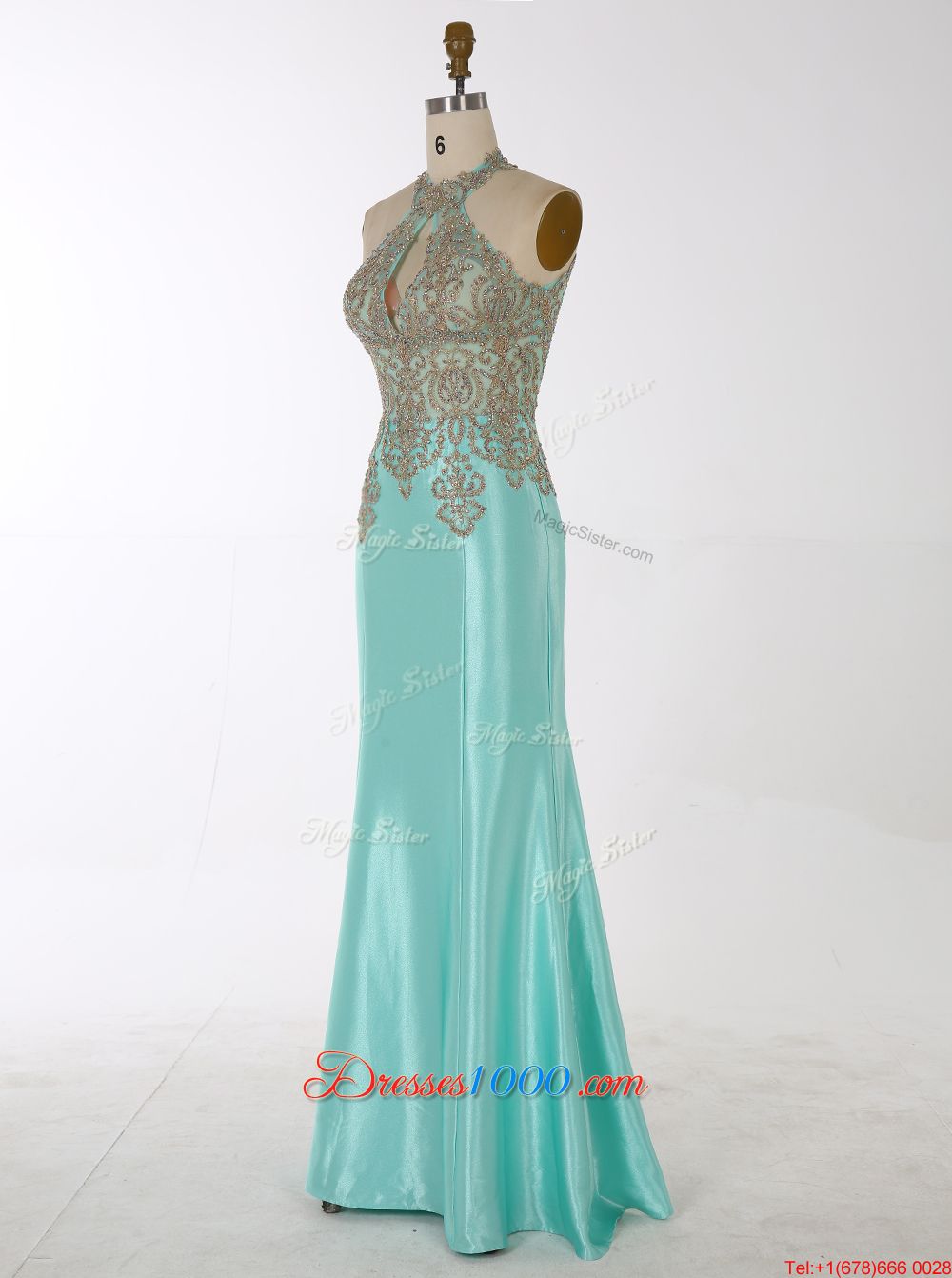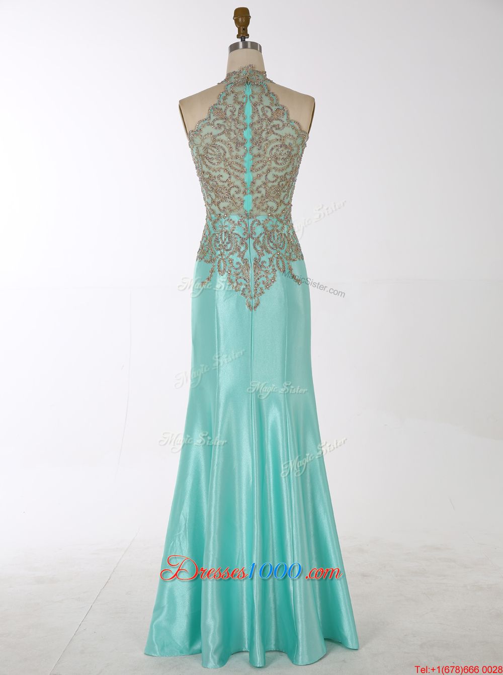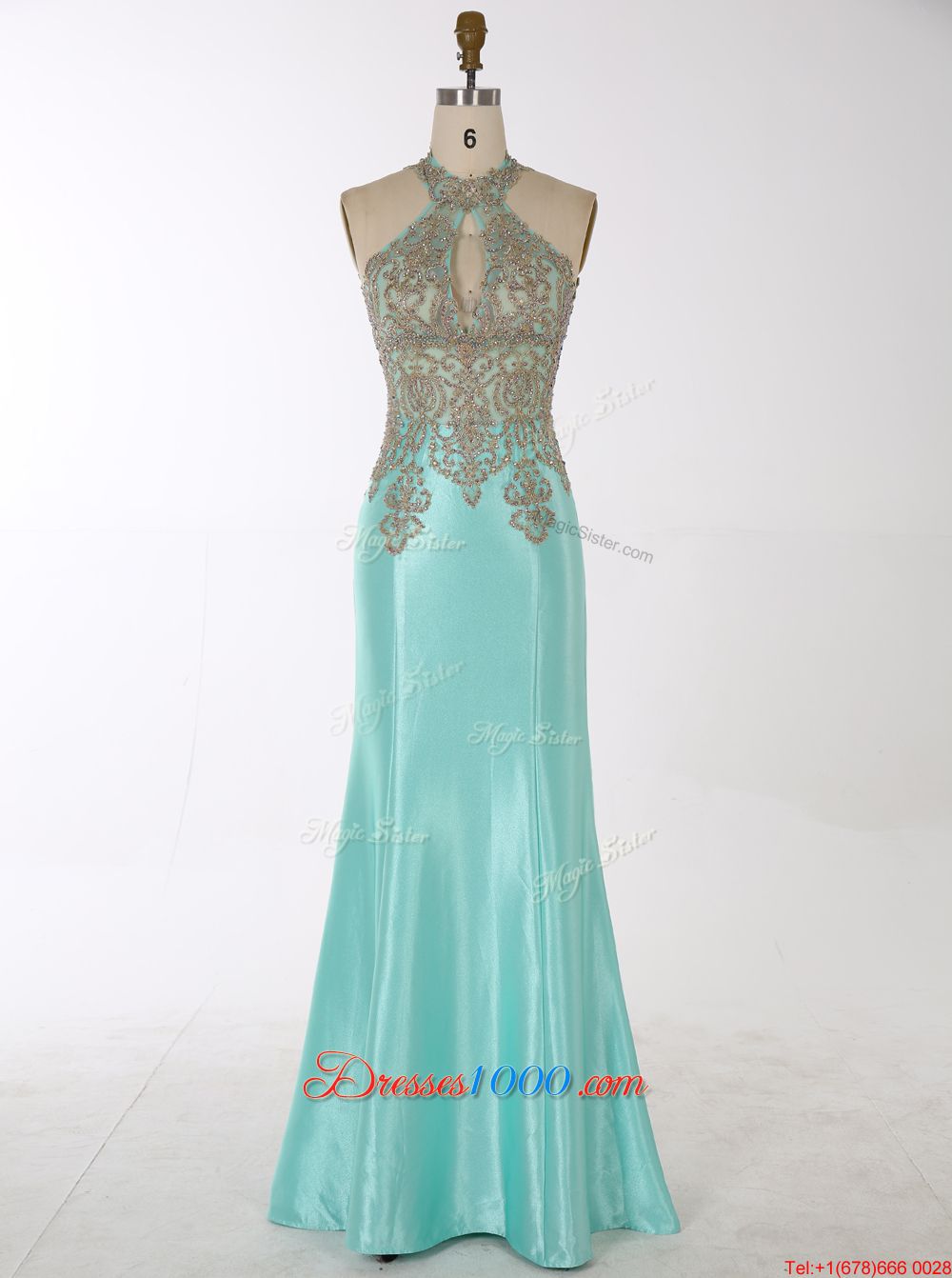 Best Selling Aqua Blue Mermaid High-neck Sleeveless Satin Floor Length Zipper Beading Homecoming Party Dress