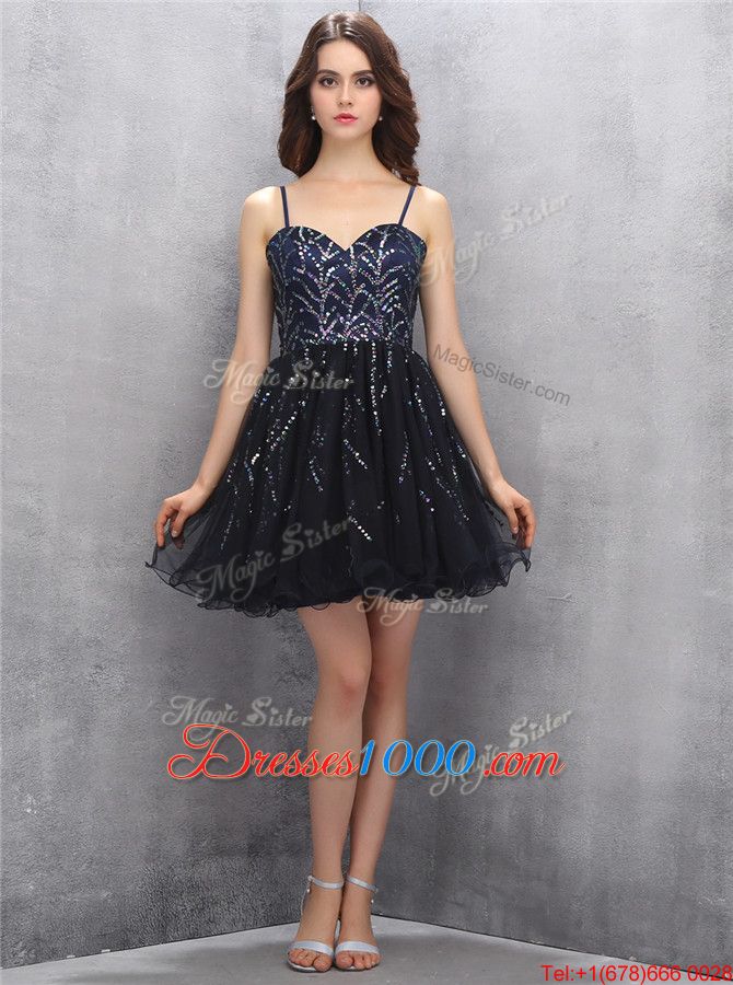 Traditional Black Tulle Lace Up Spaghetti Straps Sleeveless Mini Length Evening Gowns Sequins