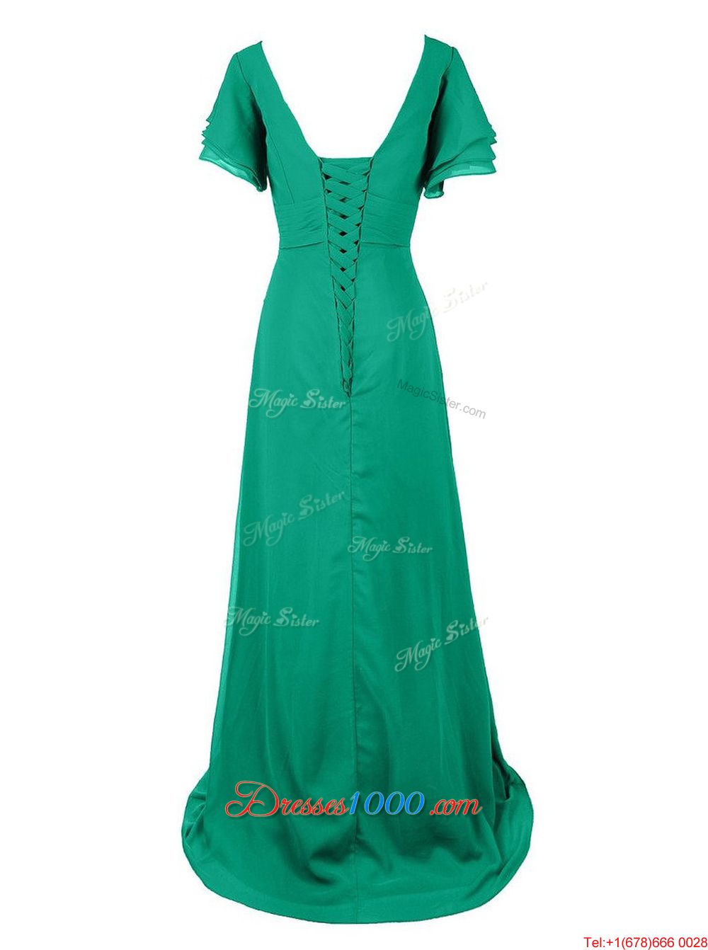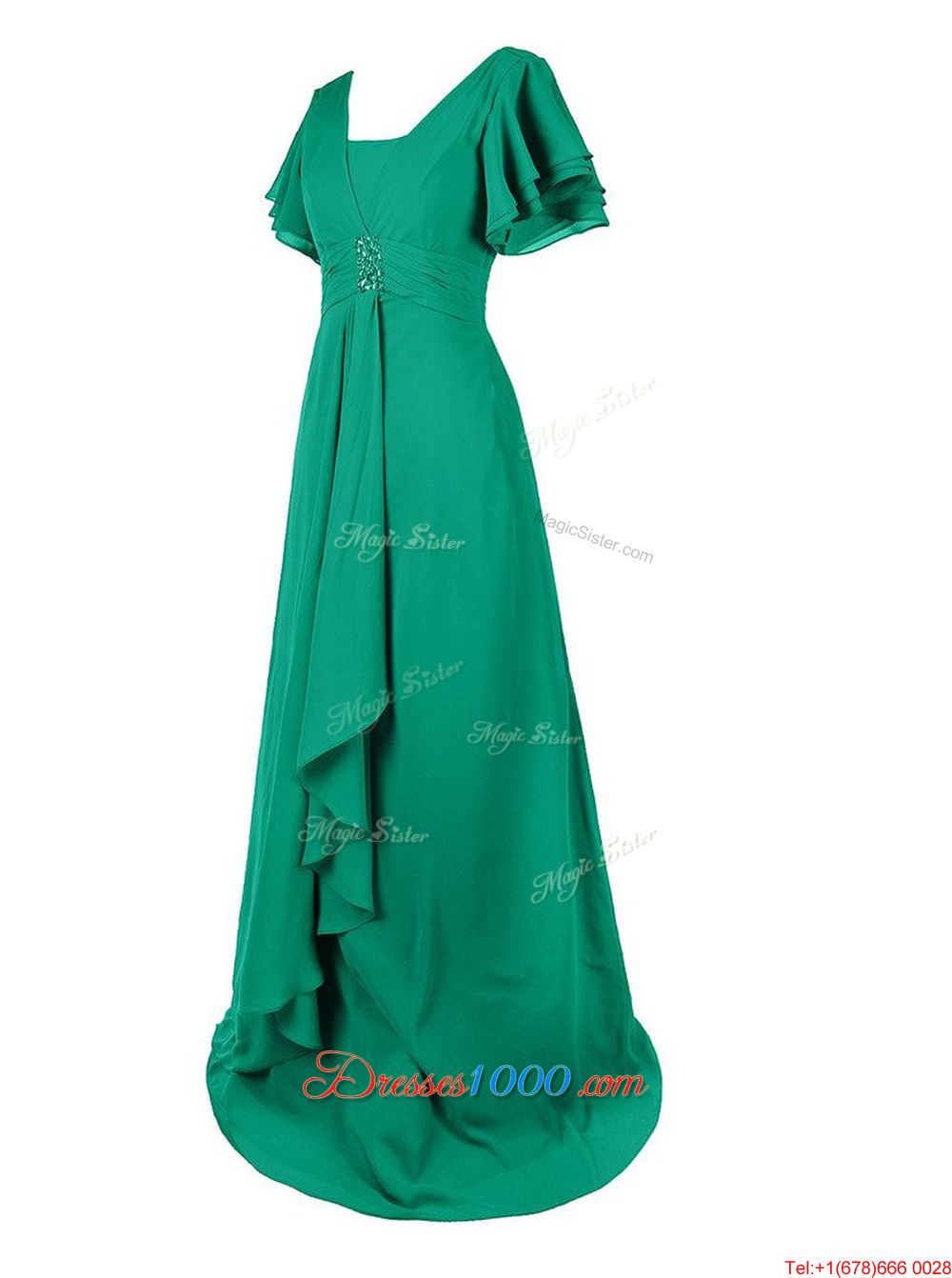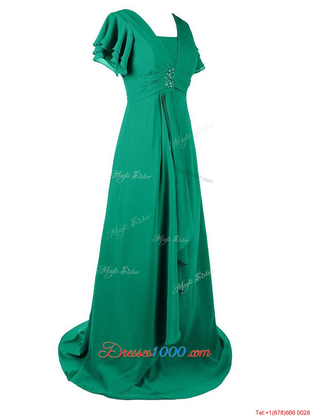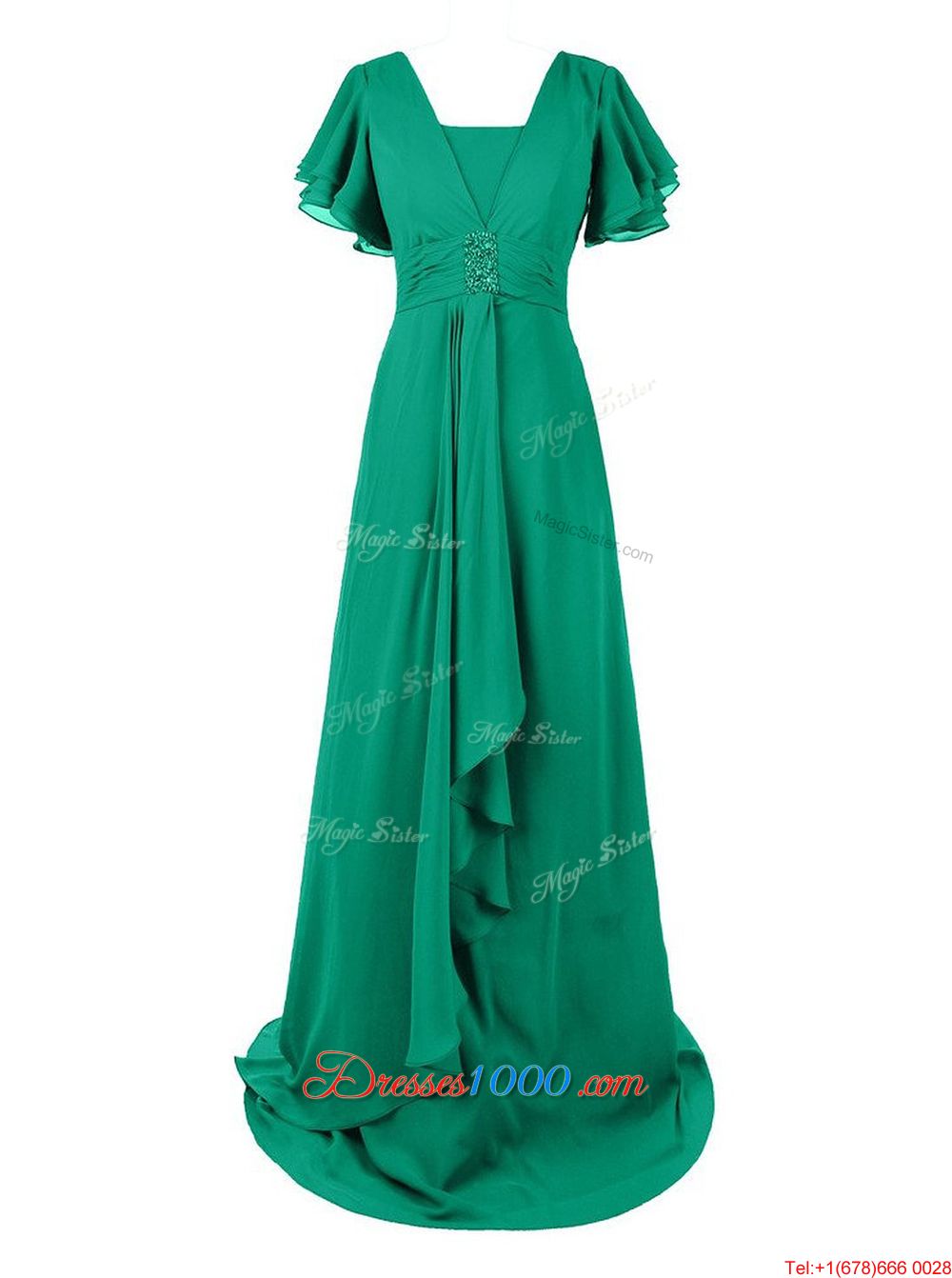 Shining Green Chiffon Zipper Prom Gown Short Sleeves With Train Sweep Train Beading and Ruching