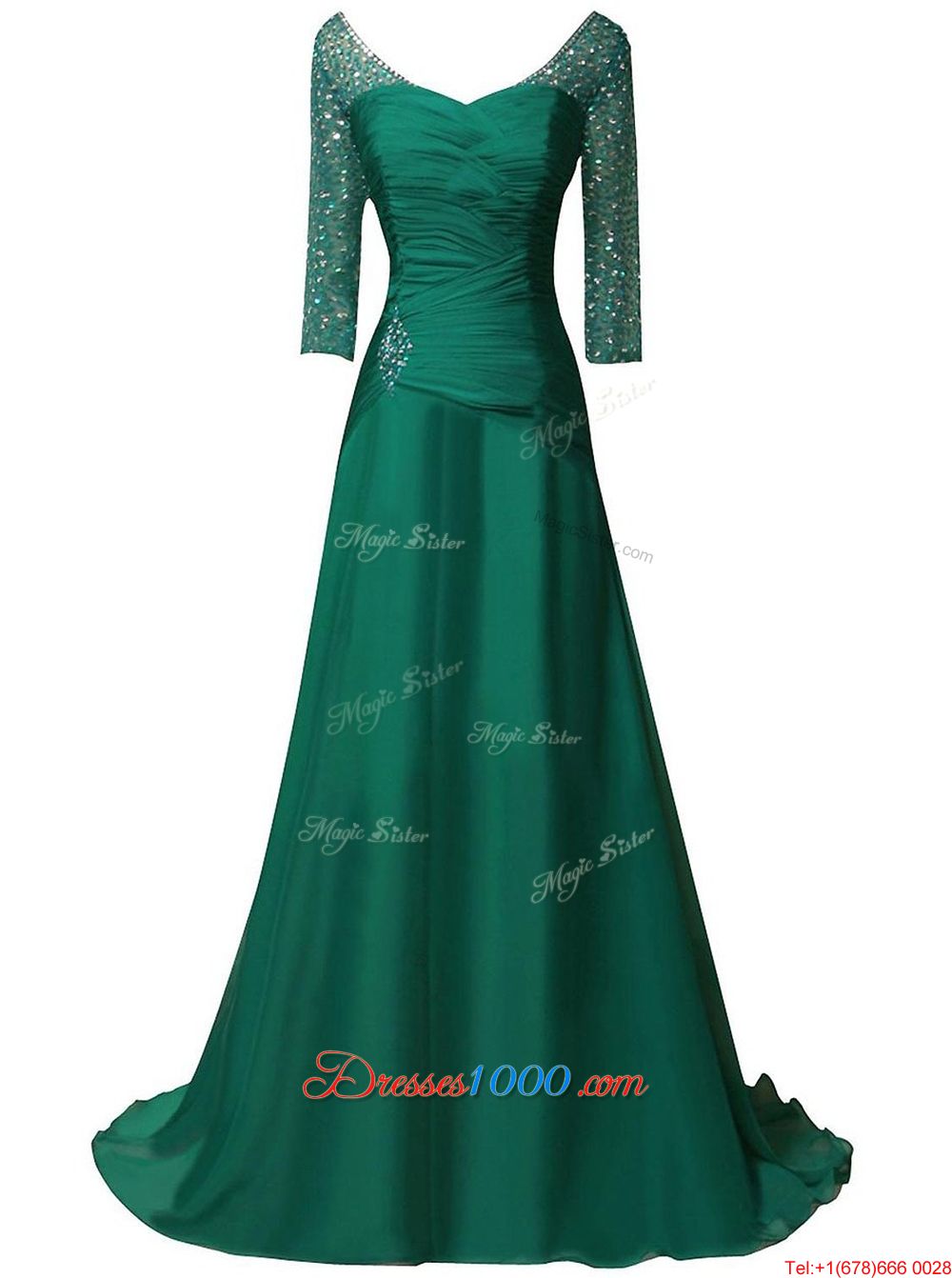 V-neck Long Sleeves Chiffon Beading and Ruching Sweep Train Zipper