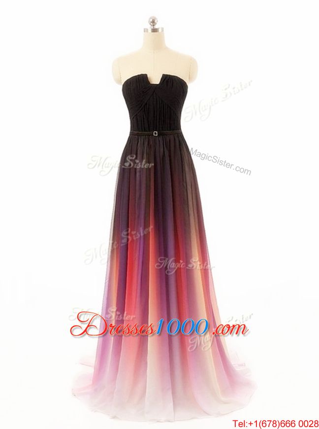 Sleeveless Chiffon and Fading Color With Train Sweep Train Zipper Juniors Evening Dress in Multi-color for with Belt