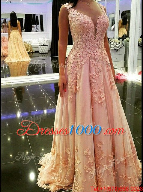 Spectacular Peach Tulle Backless Evening Dress Sleeveless Floor Length Appliques