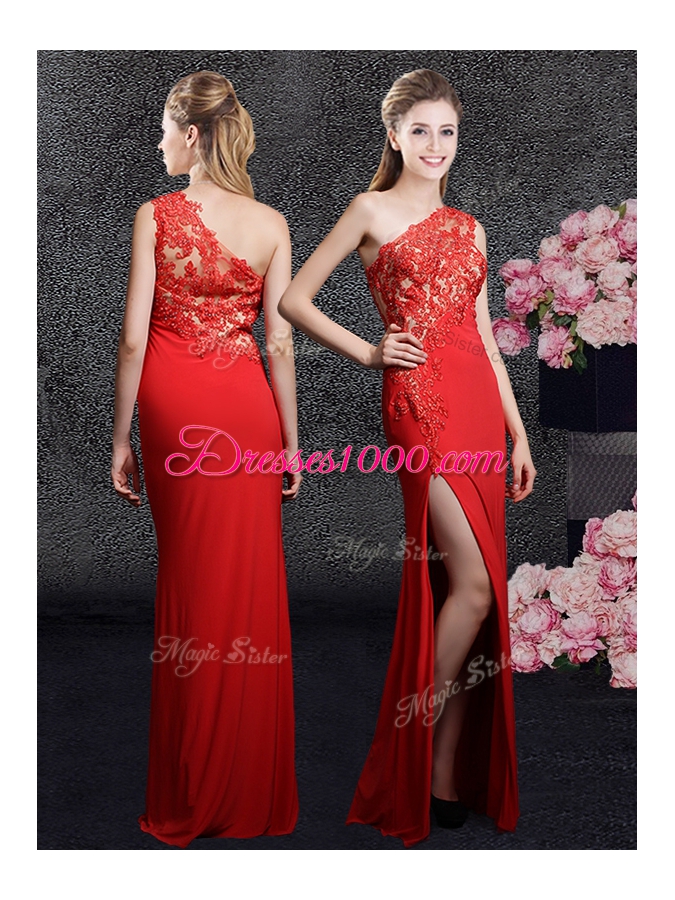 Custom Design One Shoulder Sleeveless Homecoming Dress Floor Length Lace and Appliques Red Chiffon