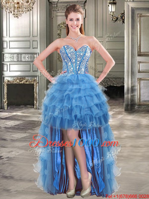 Shining Blue A-line Organza Sweetheart Sleeveless Beading and Ruffled Layers High Low Lace Up Winning Pageant Gowns