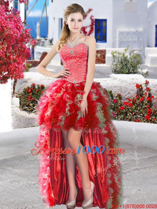 Red Organza Lace Up Sweetheart Sleeveless High Low Pageant Gowns Beading and Ruffles