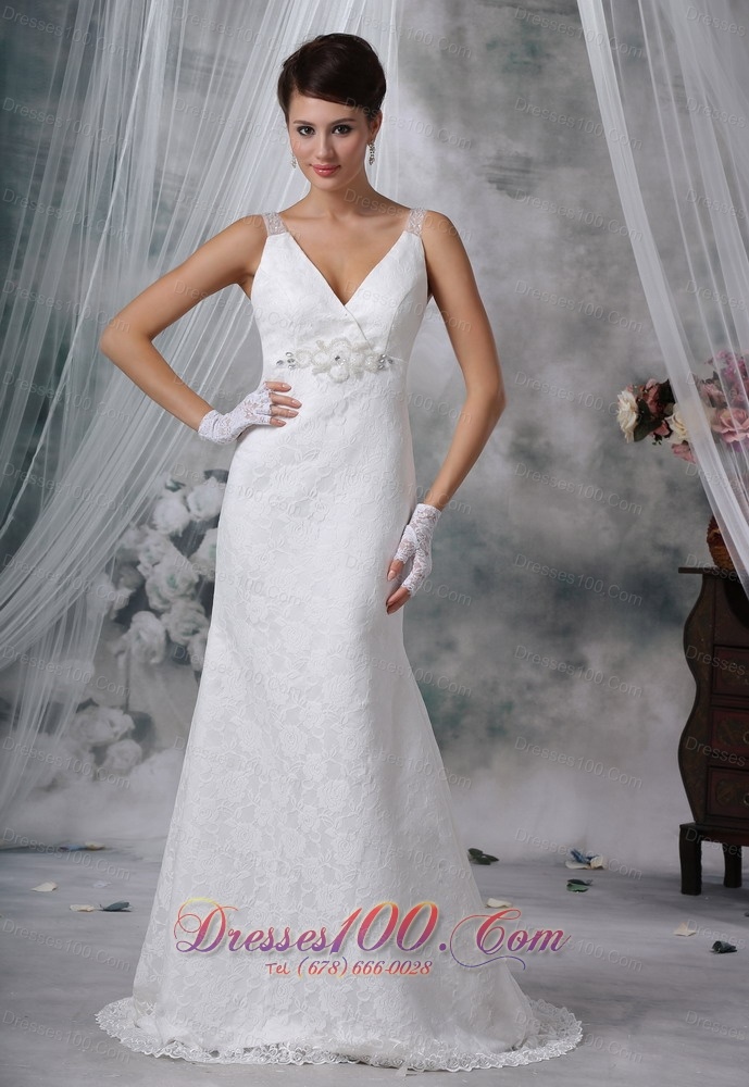 This one is truly an example of high end couture fashion. This white gown features a V neckline with two wide straps that is heavily enrusted with beading embellishments. An extra intricate crystal accents adds interest and detail to the mid-section of the dress. The beautiful full gown has a lovely train. If you're looking for a high-end dress without the high-end price tag, this is definitely one you should consider.