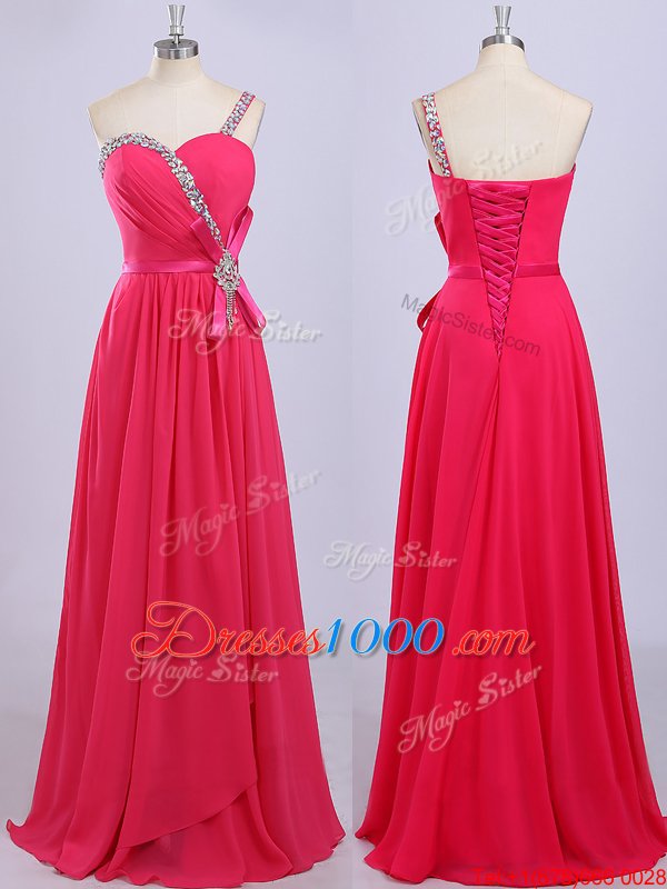 Latest Hot Pink Empire Chiffon One Shoulder Sleeveless Beading and Belt Floor Length Zipper