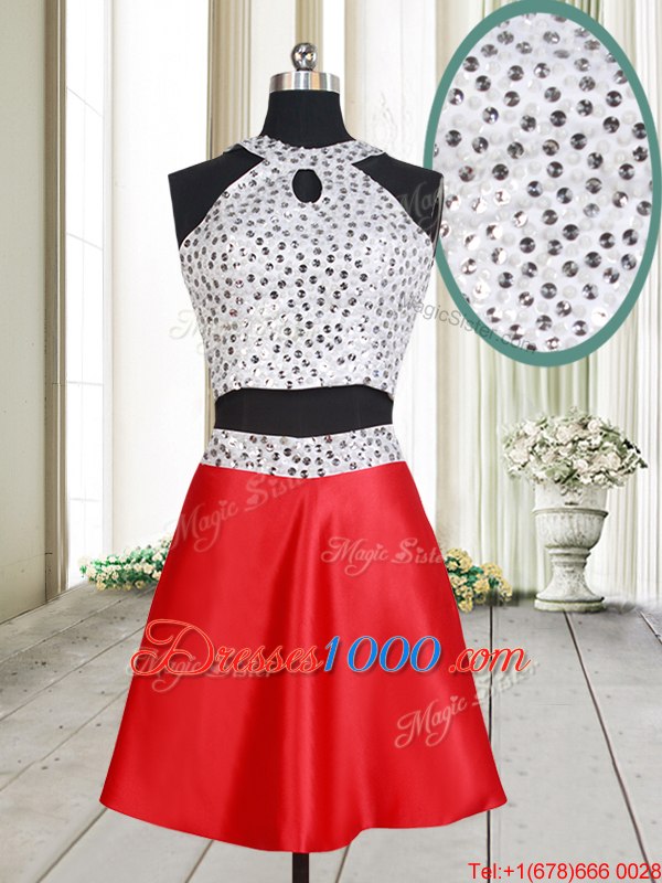 New Arrival Halter Top Sleeveless Mini Length Beading Criss Cross Dress for Prom with White And Red