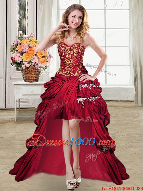 Nice High Low Wine Red Pageant Dress for Teens Taffeta Sleeveless Beading and Appliques and Pick Ups