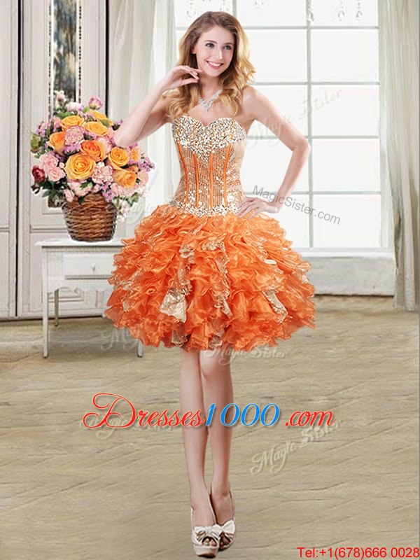 Orange Lace Up Sweetheart Beading and Ruffles and Sequins Juniors Party Dress Organza Sleeveless