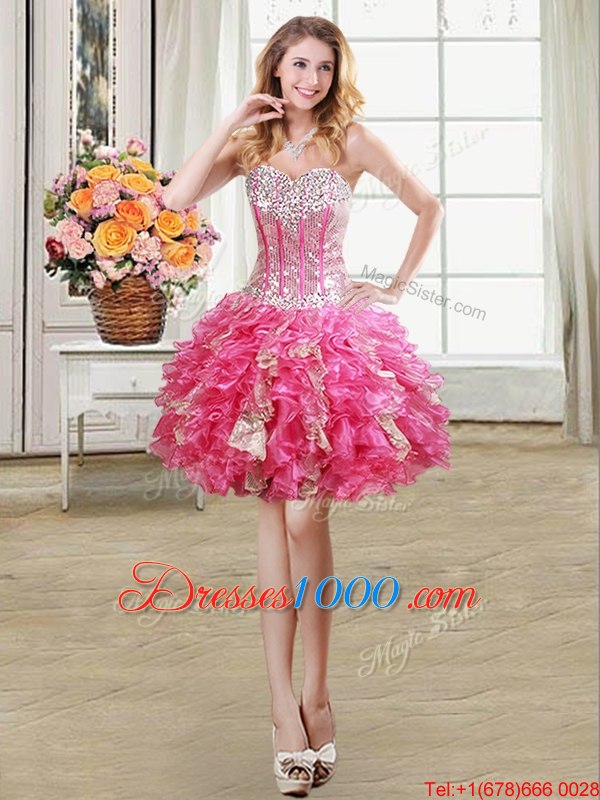 Elegant Hot Pink Sweetheart Neckline Beading and Ruffles and Sequins High School Pageant Dress Sleeveless Lace Up