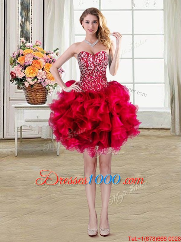 Sleeveless Mini Length Beading and Ruffles Lace Up High School Pageant Dress with Red