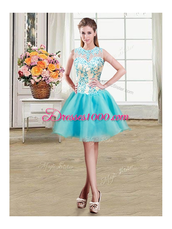 Scoop See Through Sleeveless Mini Length Beading Zipper Pageant Dress Womens with Aqua Blue