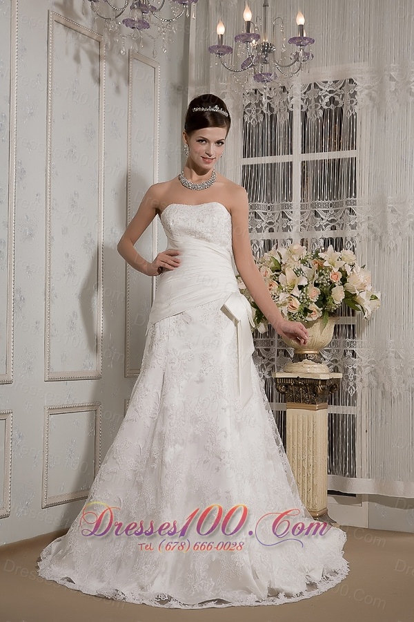 Wedding gowns with lots of lace details are very romantic.This charming features a beautiful almost lace overlay, the pleats in the middle section add more details to the dress.The A-line skirt features a gorgeous lace overlay as well that extends into a lovely chapel-length train in the back. It really creates a lovely silhouette.