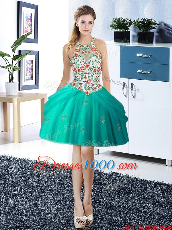 Halter Top Turquoise Ball Gowns Embroidery and Pick Ups Glitz Pageant Dress Lace Up Tulle Sleeveless Mini Length