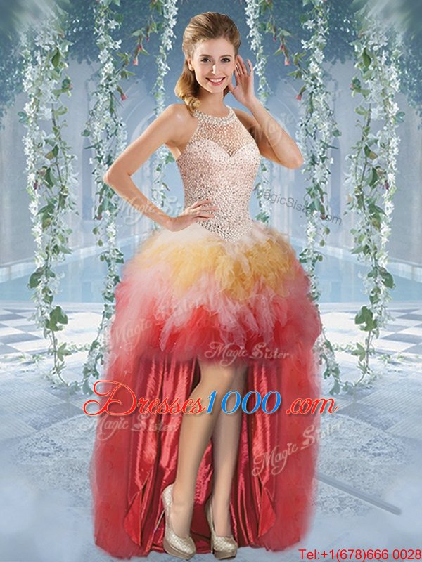 Colorful Halter Top Multi-color Tulle Lace Up Pageant Dress Sleeveless High Low Beading and Ruffles