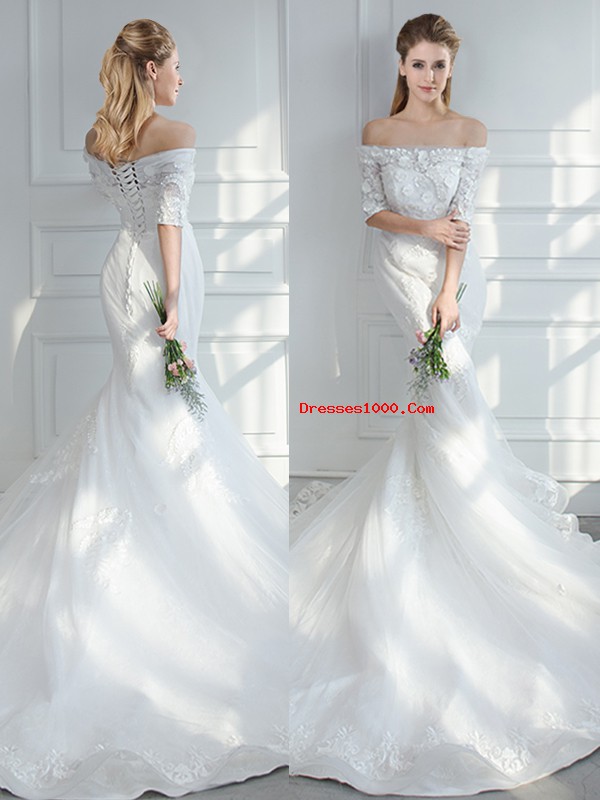 Gorgeous White Lace Up Bridal Gown Lace and Appliques Half Sleeves Court Train