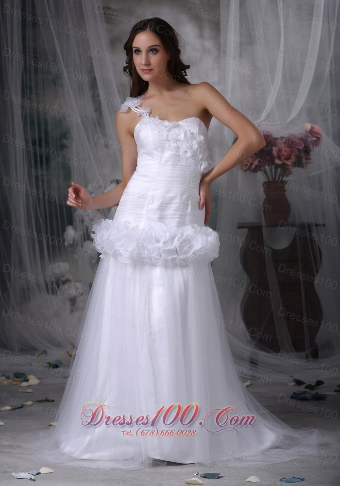 Encrusted in handmade flowers at the bust and the hips area, this elaborate dress has panache. Ruched material winds around the bodice from the shoulder to the hips. The simple design will definitely flatter your body. The light sheer layers create a flowing skirt at the bottom of this dress that creates a sensual hourglass silhouette. A hidden zipper back finishes the perfect design.