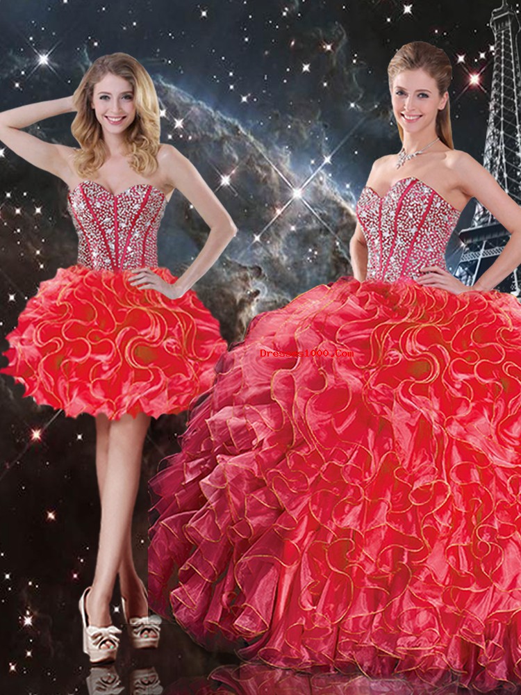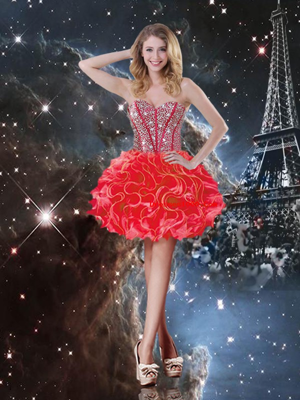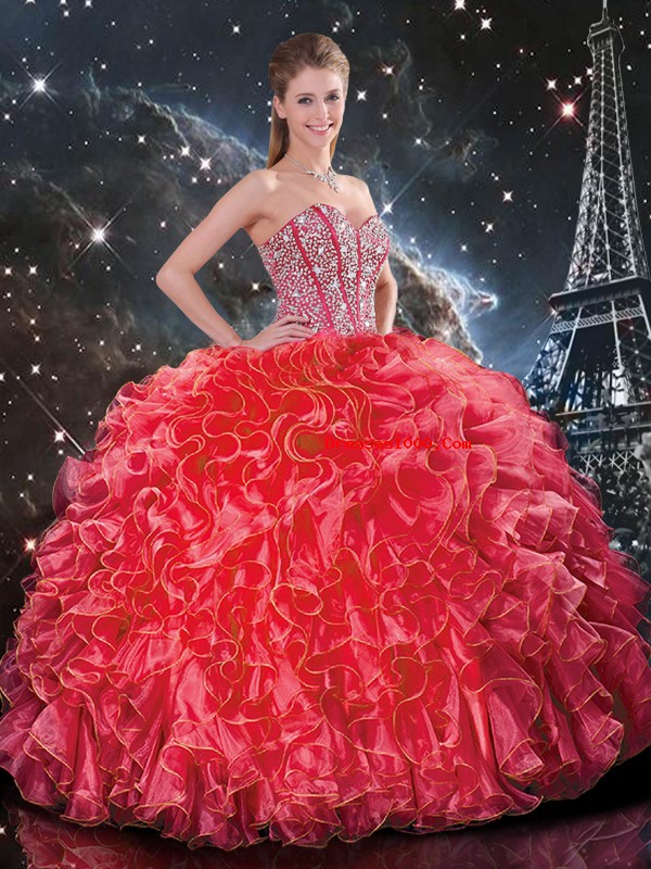 Sweetheart Sleeveless Quinceanera Gowns Floor Length Beading and Ruffles Coral Red Organza