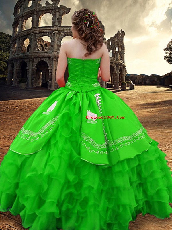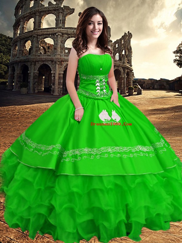 Traditional Green Strapless Zipper Embroidery and Ruffled Layers Quinceanera Dress Sleeveless