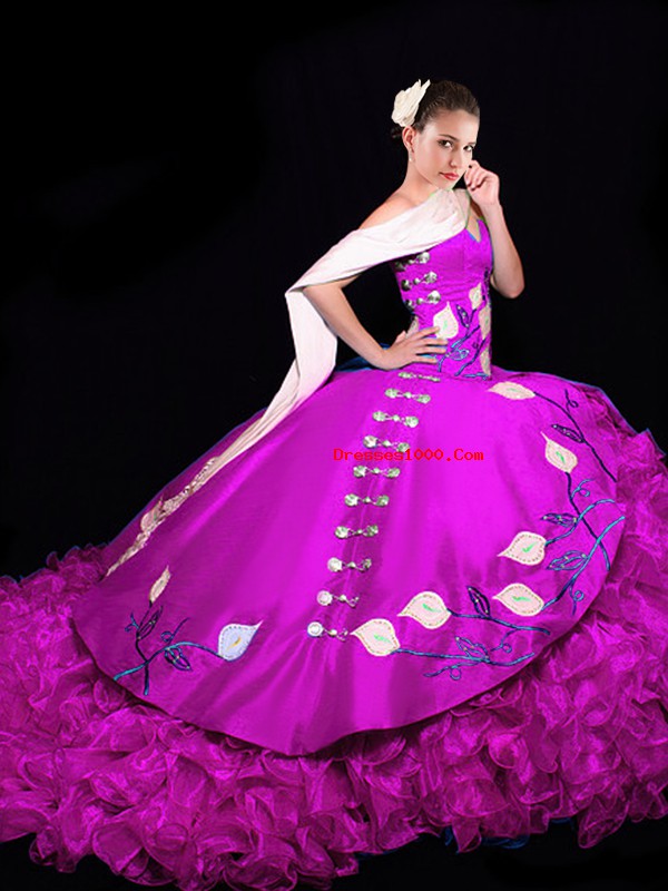 Fuchsia V-neck Lace Up Embroidery and Ruffles Vestidos de Quinceanera Brush Train Sleeveless