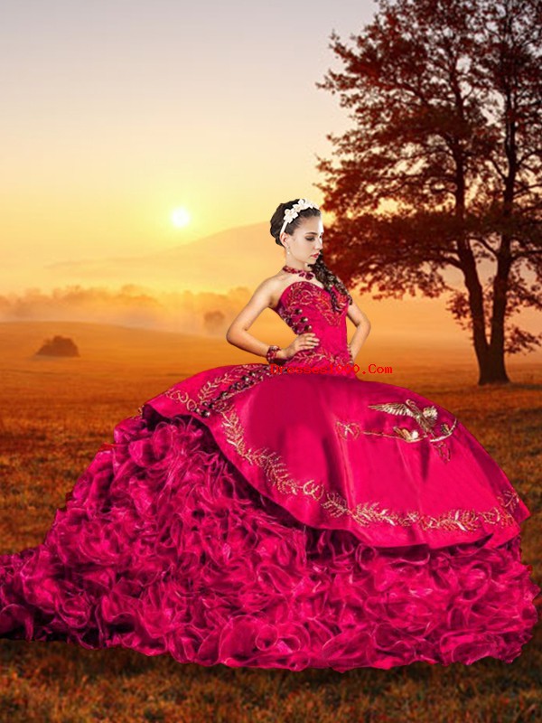 Elegant Lace Up Sweet 16 Dress Red for Military Ball and Sweet 16 and Quinceanera with Embroidery and Ruffles Brush Train