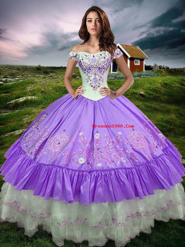 Lavender Off The Shoulder Lace Up Beading and Embroidery and Ruffled Layers Quince Ball Gowns Sleeveless