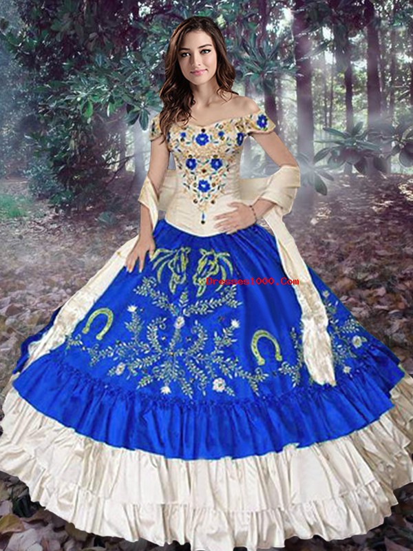 Off The Shoulder Sleeveless Ball Gown Prom Dress Floor Length Embroidery and Ruffled Layers Royal Blue Taffeta