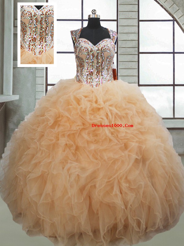 Ball Gowns Quinceanera Dresses Champagne Sweetheart Organza Sleeveless Floor Length Lace Up