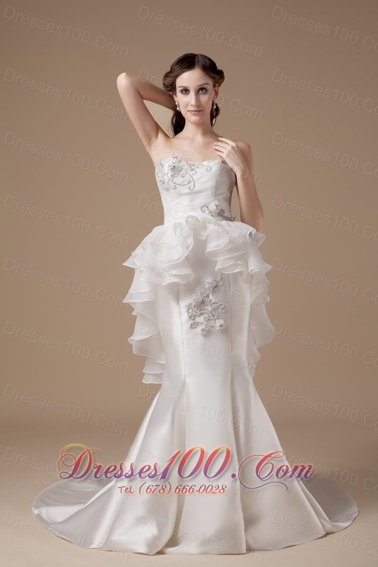 An elegant and romantic wedding gown. It has a lovely strapless bodice with a gathered texture and dreamful skirt. The bodice is made from smooth taffeta which makes the dress more dignity. The midsection of the gown is cinched by gorgeous embroidery that perfectly complements the rhinestones on the bodice. The dainty ruffles and the mermaid style skirt add to the romantic statemant. A lace up closure in the back secures the dress and completes this perfect design.