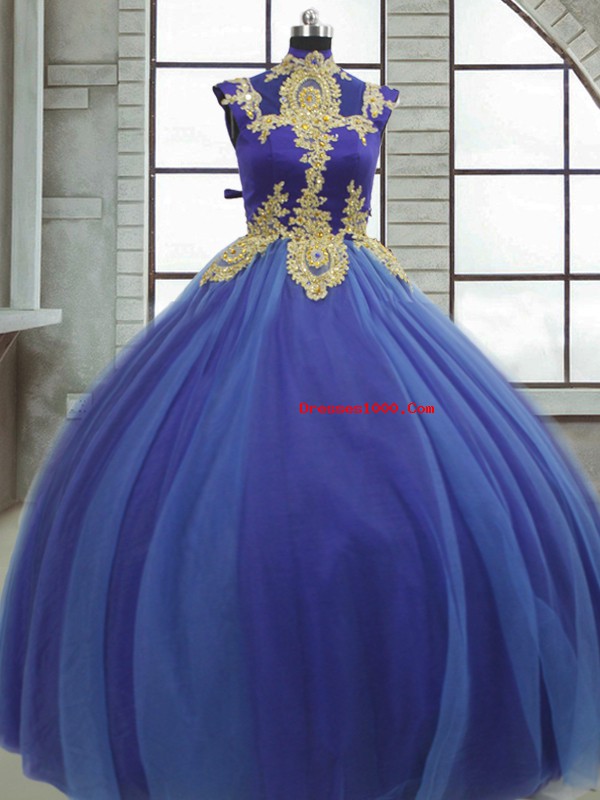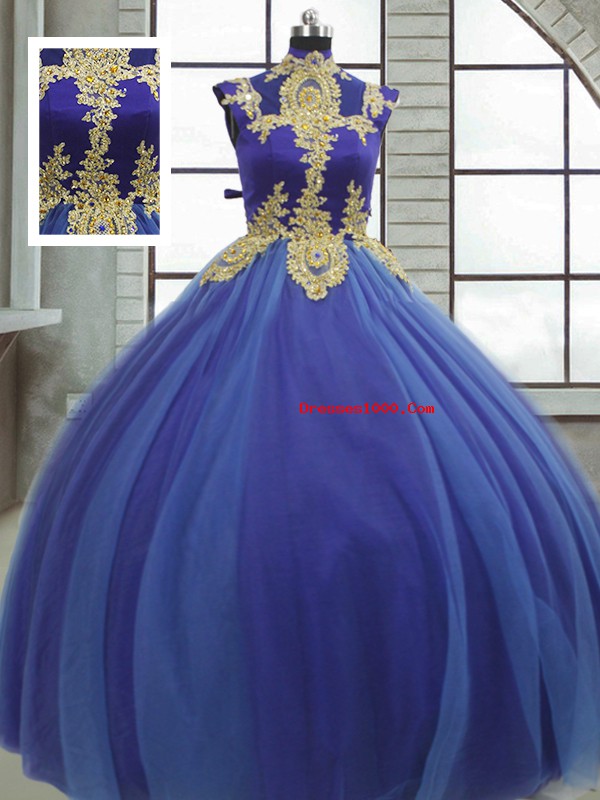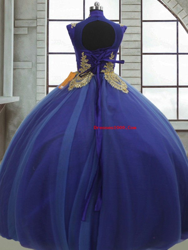 Spectacular Royal Blue Lace Up High-neck Appliques Quinceanera Gowns Tulle Sleeveless