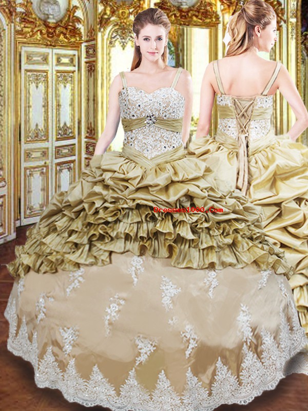 Shining Champagne Straps Neckline Beading and Appliques and Ruffled Layers and Pick Ups Sweet 16 Dresses Sleeveless Lace Up