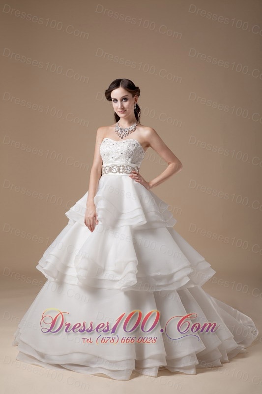 This fabulous wedding dress features a sexy sweetheart neckline and an romantic layered skirt. The strapless bodice is heavily embelished by shimmering beading and the midsection of the gown is cinched by a gorgeous heavily embellished belt that perfectly complements the rhinestones on the bodice. The layers in the skirt and the chapel train make the dress like a blooming flower. A zipper-style closure secures the dress in place and ensures a great fit.