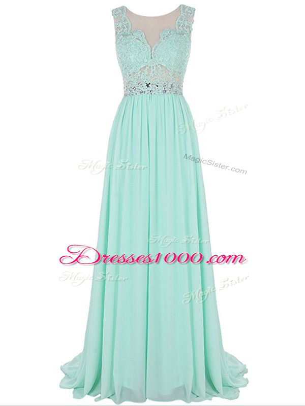 Glorious Sleeveless Chiffon Brush Train Backless Prom Party Dress in Apple Green with Beading and Lace and Appliques
