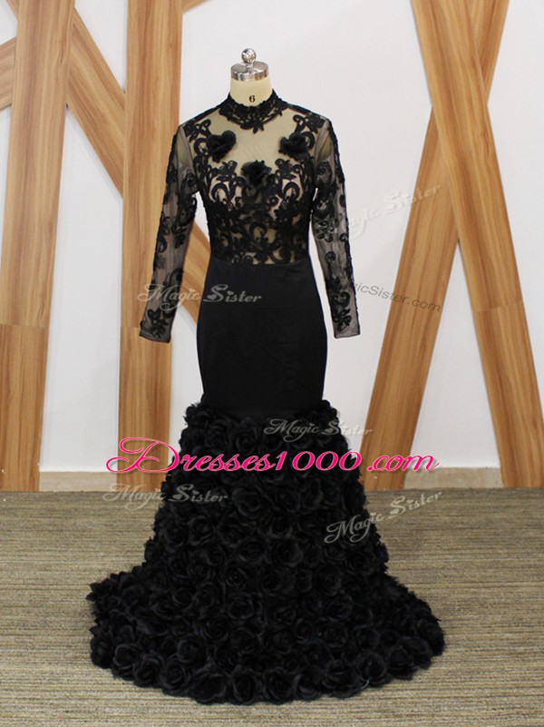 New Arrival High-neck Long Sleeves Fabric With Rolling Flowers Mother Dresses Beading and Lace and Appliques and Hand Made Flower Brush Train Backless