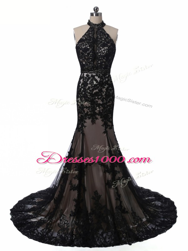 High Quality Black Mother of the Bride Dress Tulle and Lace Brush Train Sleeveless Lace and Appliques